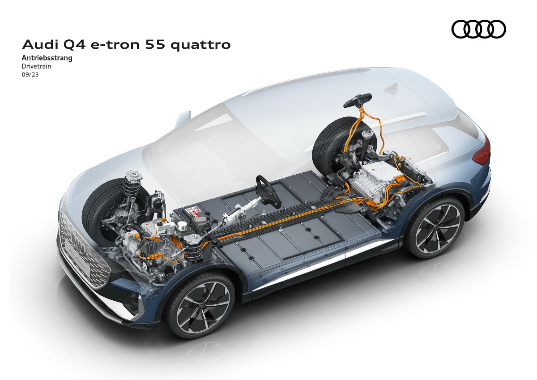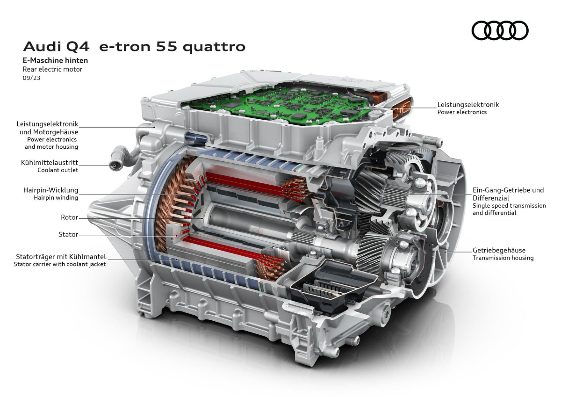 Ve všech verzích modelu Audi Q4 e-tron – ať s pohonem zadních kol, nebo s pohonem všech kol quattro – pracuje na zadní nápravě synchronní elektromotor s permanentními magnety. V rámci modernizace obdržela modelová řada Audi Q4 e-tron zcela nově vyvinutý synchronní elektromotor s permanentními magnety, který vyniká vyšší hospodárností a větším výkonem. Modernizované modely díky tomu profitují z delšího dojezdu a suverénní výkonové charakteristiky. Například Audi Q4 Sportback 45 e-tron dosahuje v jízdním cyklu WLTP dojezdu na jedno nabití až 562 kilometrů.