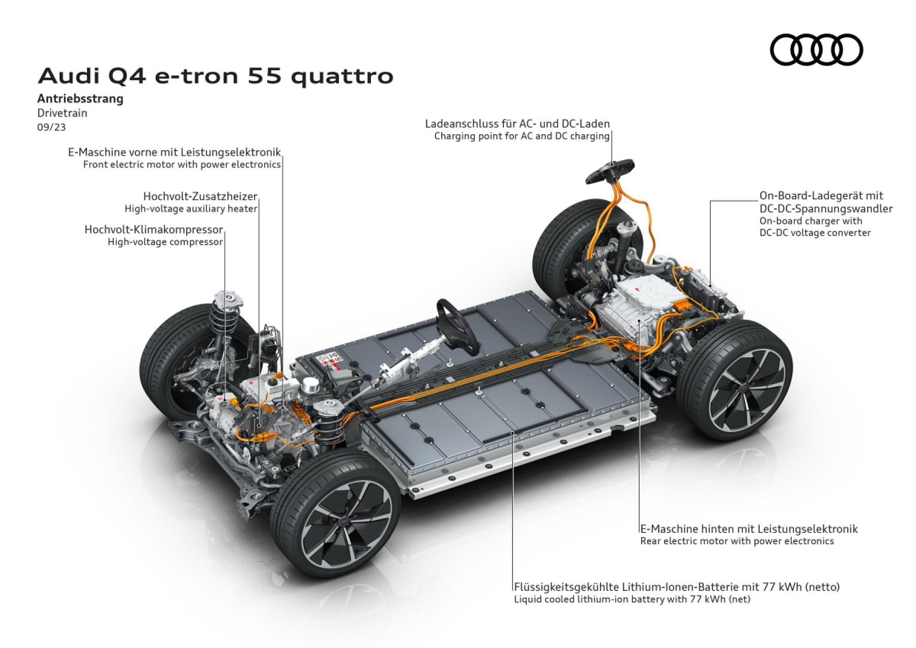 Ve všech variantách modelu Q4 e-tron je uložena sada akumulátorů o využitelné kapacitě 77 kWh (celková 82 kWh). Díky optimalizovanému chemickému složení akumulátorových článků se zvýšil výkon při nabíjení stejnosměrným proudem. Akumulátorovou baterii tak lze za ideálních podmínek nabít z deseti na 80 procent za cca 28 minut. Verze quattro přitom dosahují na stejnosměrných nabíječkách maximálního nabíjecího výkonu 175 kW, varianty s pohonem zadních kol až 135 kW.