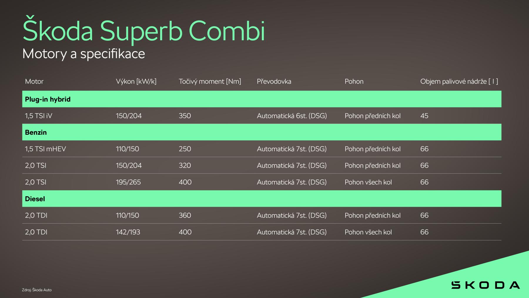 Mezi šest moderních, úsporných pohonných jednotek patří také nová generace plug-in hybridního pohonu, který je součástí modelu Superb Combi iV. Motor 1,5 TSI v kombinaci s elektromotorem poskytuje systémový výkon 150 kW (204 k) a nově nabízí elektrický dojezd více než 100 km v režimu WLTP. Kromě toho je motor 1,5 TSI k dispozici také s mild-hybridní technologií, což je u modelu Superb poprvé. Dále jsou v nabídce dva další benzinové motory a dva naftové motory. Vrcholná benzinová verze s výkonem 195 kW (265 k) a vrcholná naftová verze s výkonem 142 kW (193 k) jsou standardně dodávány s pohonem všech kol. Nová generace adaptivního podvozku DCC+ kombinuje komfort a jízdní dynamiku. Matrix-LED přední světlomety druhé generace umožňují ještě lepší osvětlení vozovky.