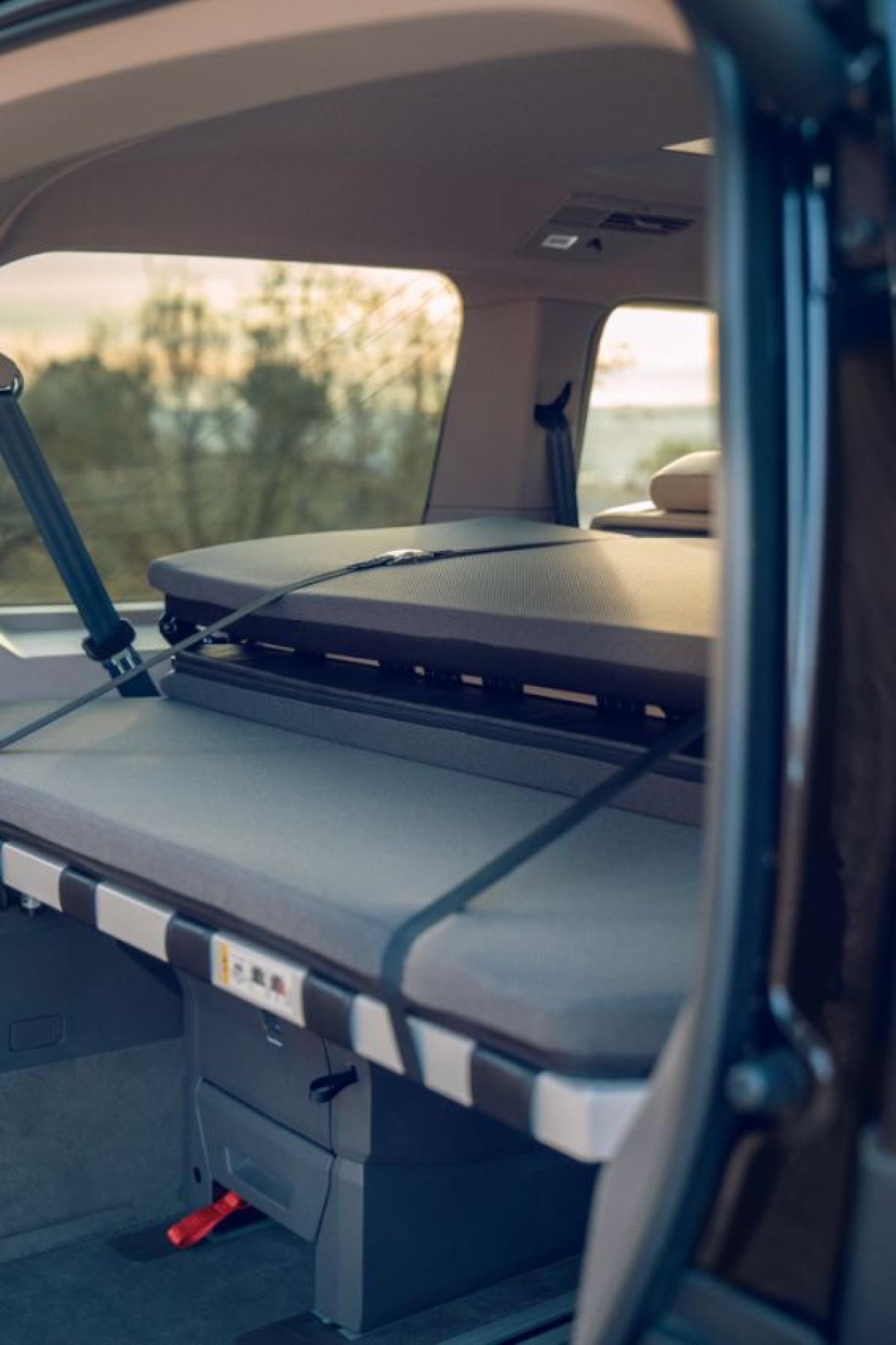 Pozoruhodný je nový koncept skládacího lůžka, které je tvořeno lamelovým roštem a komfortní matrací o délce 2,02 metru a šířce 1,21 metru. Lůžko je uloženo na čepech spojených pevně s karoserií, nikoliv na sedadlech. Díky tomu je možné lůžko několika úkony rozložit v prostoru pro cestující přes všechna složená sedadla. Anebo lze zadní sedadla vyjmout a místo pod lůžkem pak využít jako velkoryse dimenzovaný odkládací prostor – například při návštěvě festivalu, rodinném kempování, nebo dokonce surfařské výpravě, protože pod lůžko lze uložit i surfová prkna. Ve složeném stavu se lůžko nachází za sedadly ve druhé řadě, respektive nad složenými sedadly třetí řady – a lze ho také snadno vyjmout.
