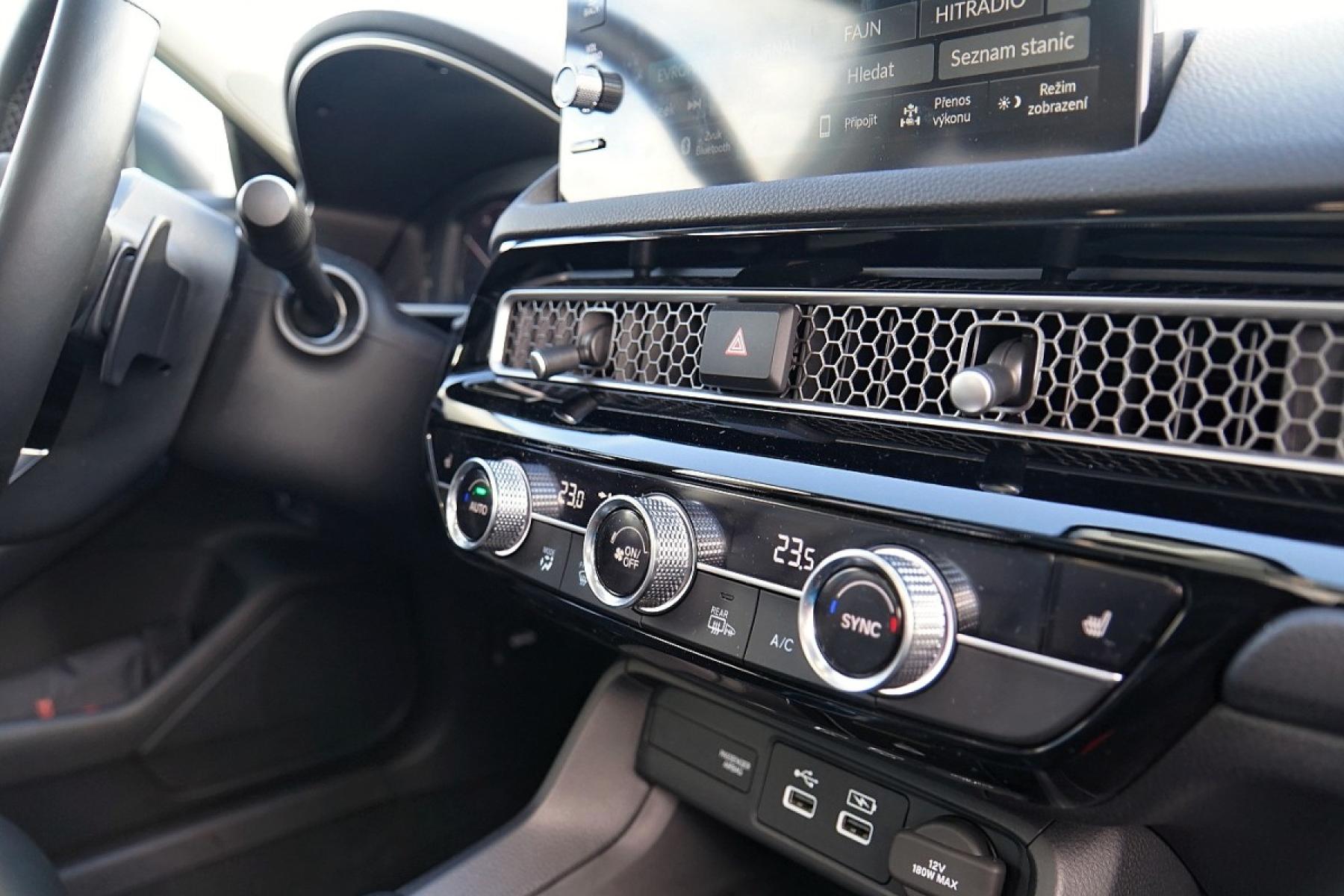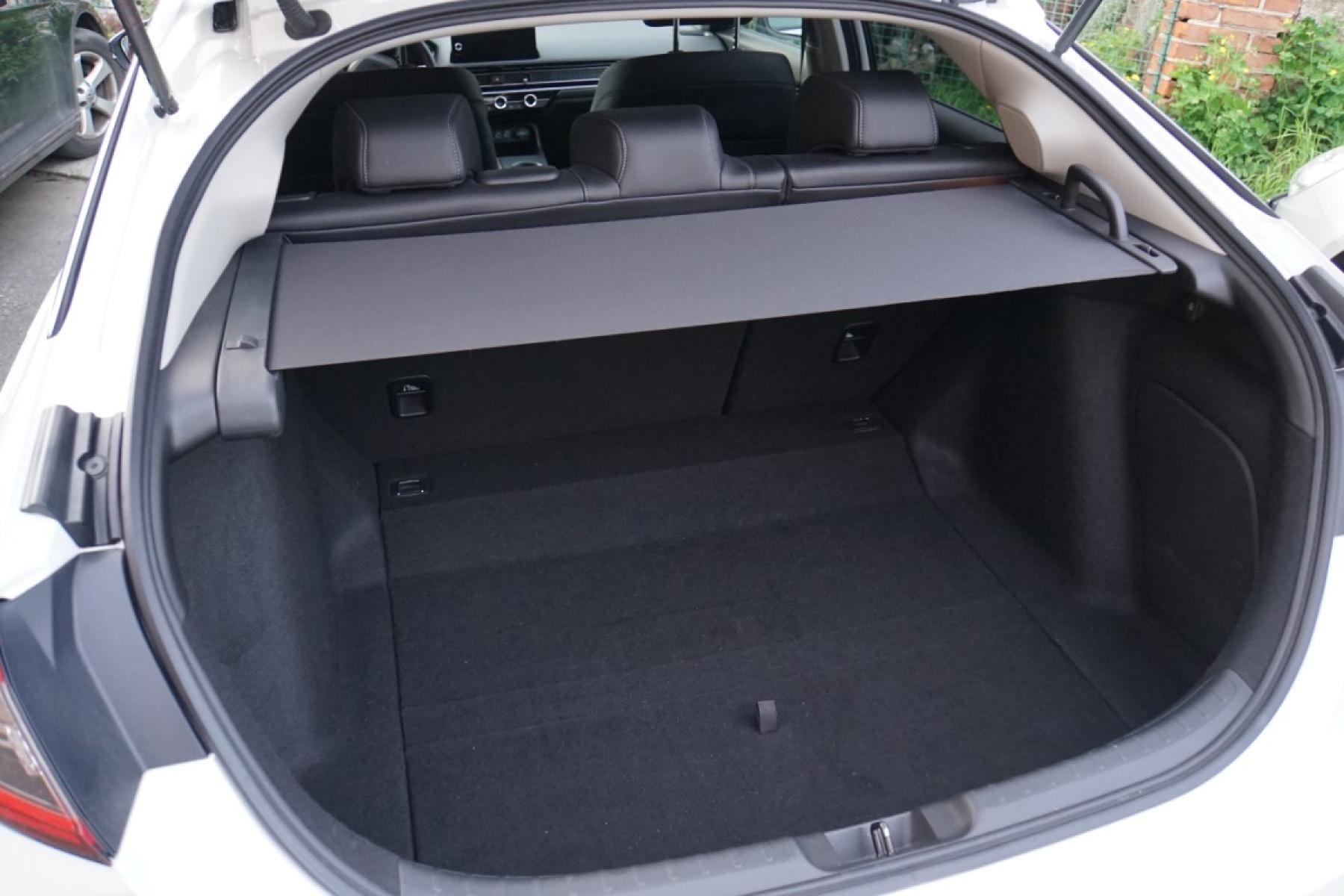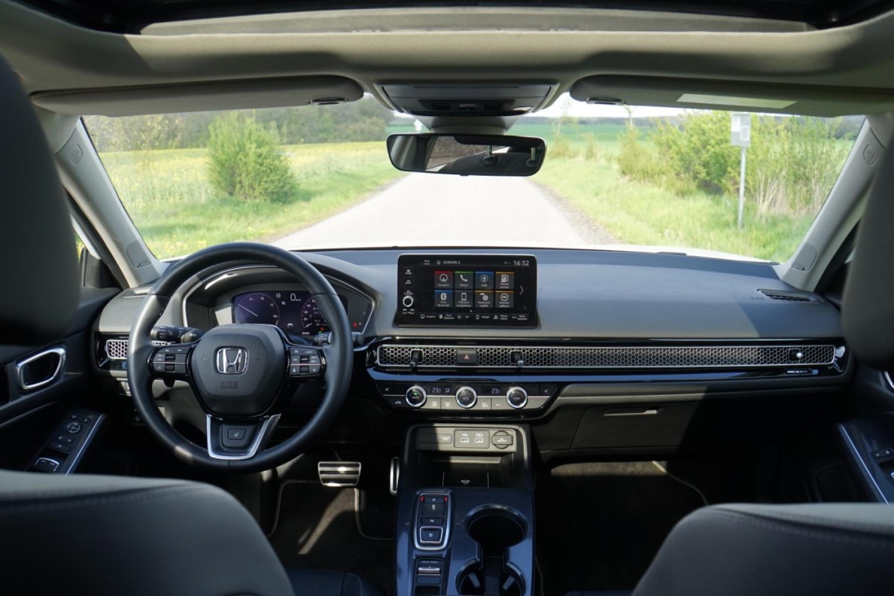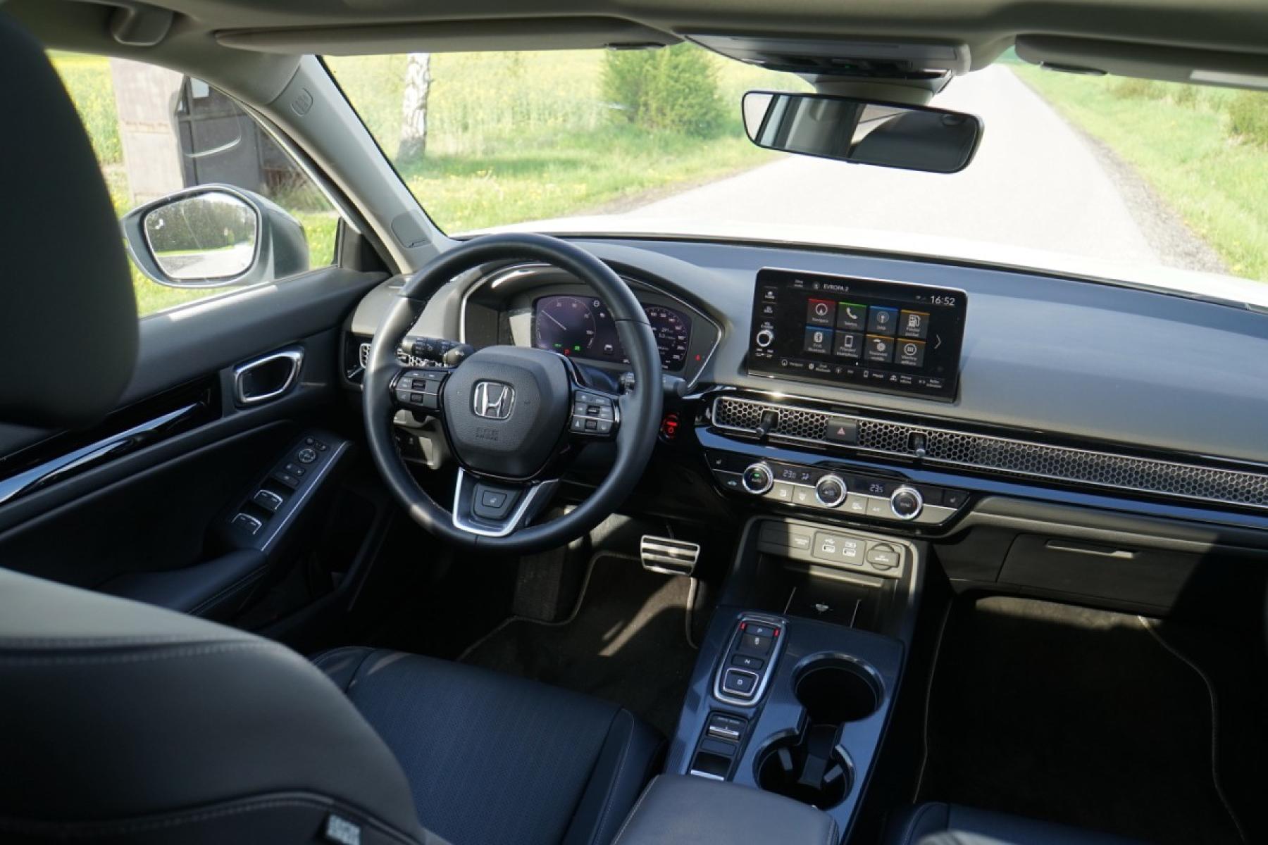Kabina zaujme příjemnými materiály, kvalitním zpracováním a designem inspirovaným Hondou e. Z palubní desky číší jednoduchost a uklizenost. Nikde nic nepřekáží a ovládání je dotaženo do posledního detailu. Nechybí klasické kruhové ovladače a fyzická tlačítka, což je v dnešní době něco nevídaného. Civic má dokonce klasické kolečko k nastavení jasu přístrojového štítu a centrálního displeje. Infotainment s displejem japonská automobilka vyřešila po svém. Kombinuje dotykové ovládání s fyzickými tlačítka umístěnými v levé části, což zvyšuje intuitivní ovládání při jízdě. Grafika a členění obrazovky je jednoduché, žádný luxus nečekejte. Infotainment je rychlý a dobře odladěn, bohužel mu navigaci chybí on-line data o hustotě provozu a bezdrátový Android Auto. Kufr s využitelným objemem 415 litrů v pohodě postačí čtyřčlenné posádce. Jeho dno není zcela rovné, ale nevadí. Zajímavě řešena je krycí roletka. Vytahuje se ze strany, takže ji můžete přetáhnout přes náklad a nijak nepřekáží.