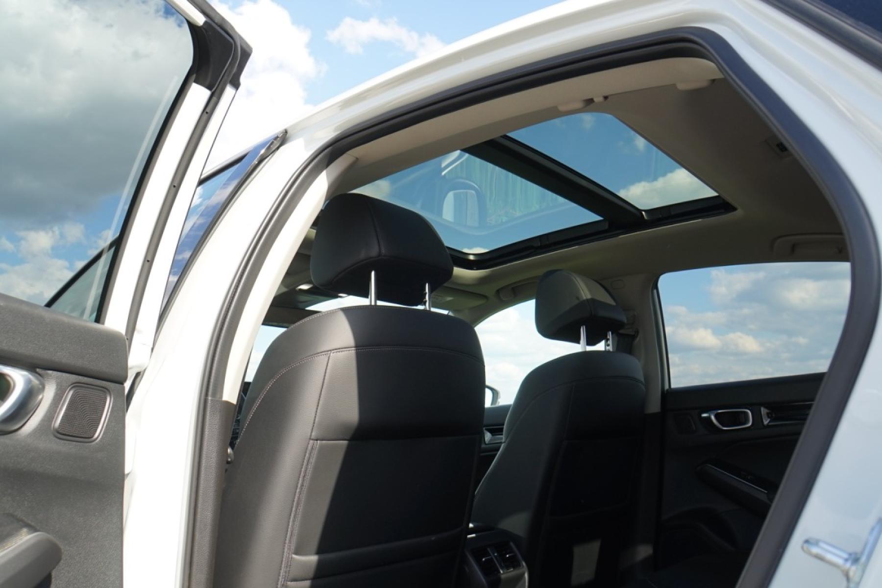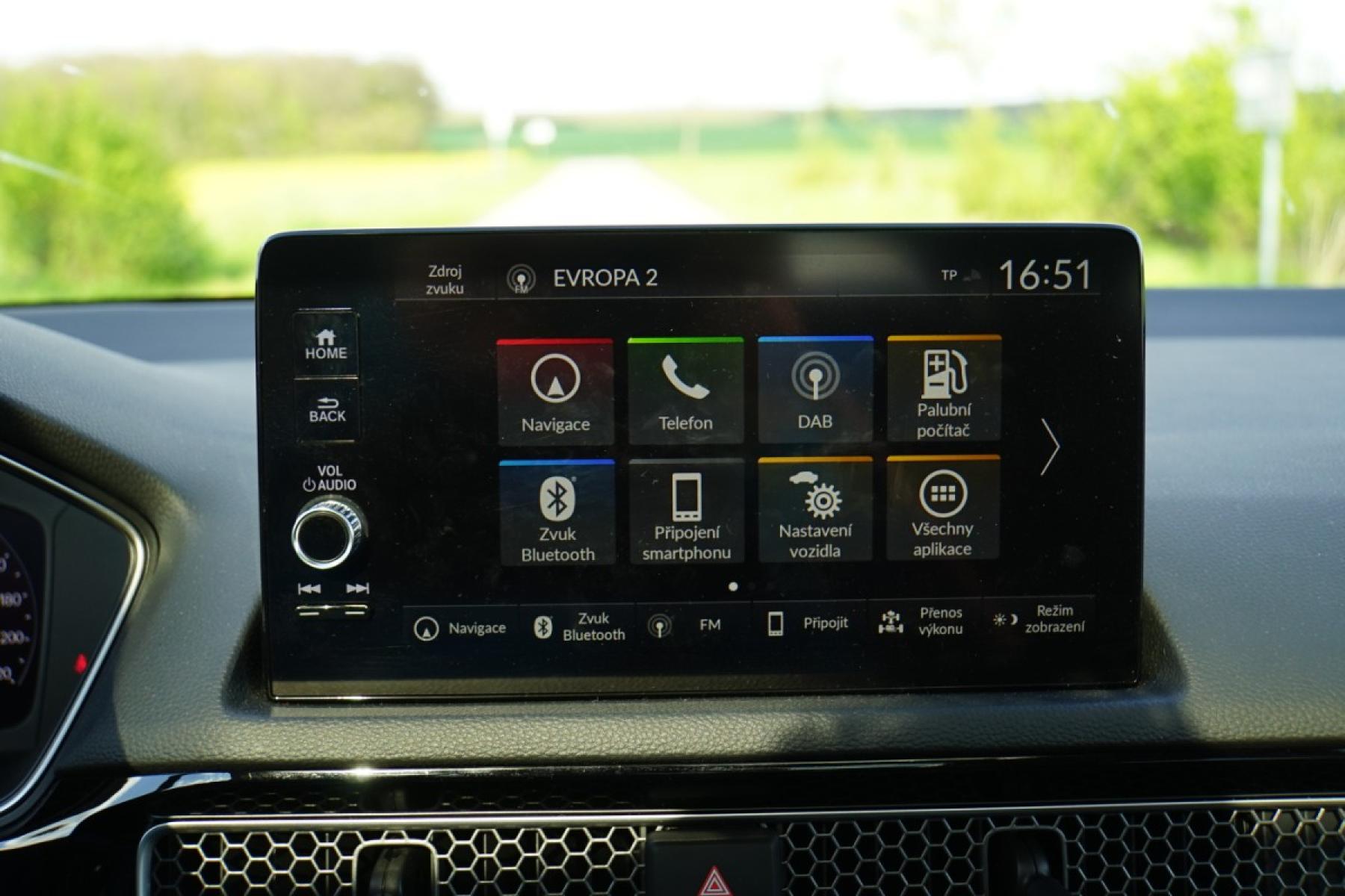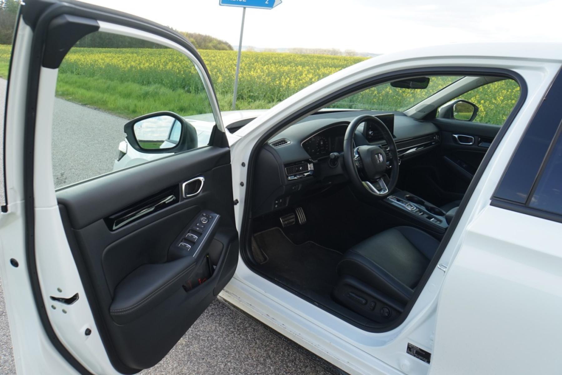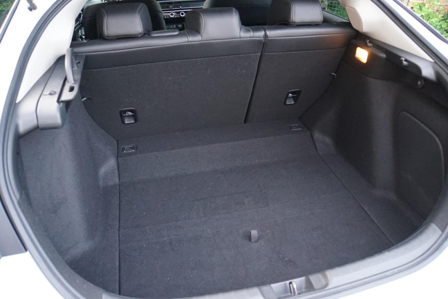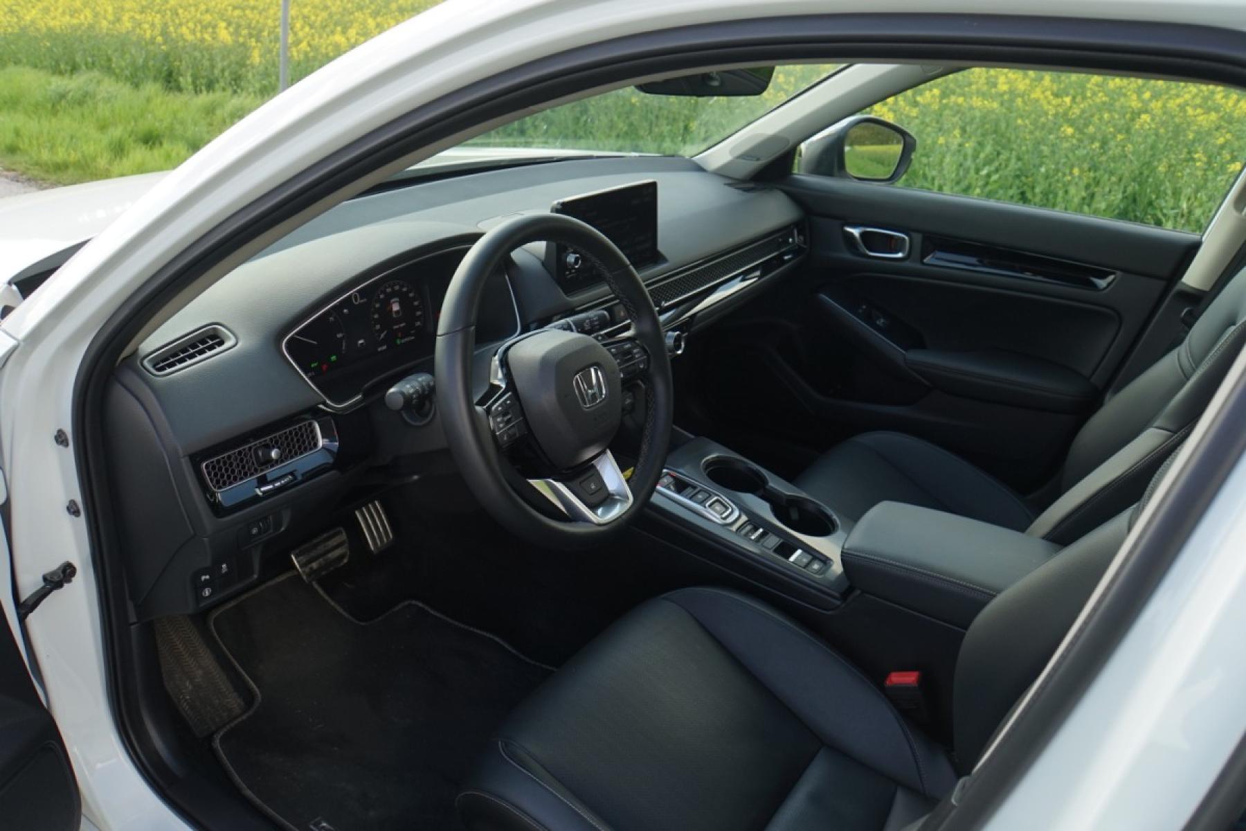Kabina zaujme příjemnými materiály, kvalitním zpracováním a designem inspirovaným Hondou e. Z palubní desky číší jednoduchost a uklizenost. Nikde nic nepřekáží a ovládání je dotaženo do posledního detailu. Nechybí klasické kruhové ovladače a fyzická tlačítka, což je v dnešní době něco nevídaného. Civic má dokonce klasické kolečko k nastavení jasu přístrojového štítu a centrálního displeje. Infotainment s displejem japonská automobilka vyřešila po svém. Kombinuje dotykové ovládání s fyzickými tlačítka umístěnými v levé části, což zvyšuje intuitivní ovládání při jízdě. Grafika a členění obrazovky je jednoduché, žádný luxus nečekejte. Infotainment je rychlý a dobře odladěn, bohužel mu navigaci chybí on-line data o hustotě provozu a bezdrátový Android Auto. Kufr s využitelným objemem 415 litrů v pohodě postačí čtyřčlenné posádce. Jeho dno není zcela rovné, ale nevadí. Zajímavě řešena je krycí roletka. Vytahuje se ze strany, takže ji můžete přetáhnout přes náklad a nijak nepřekáží.