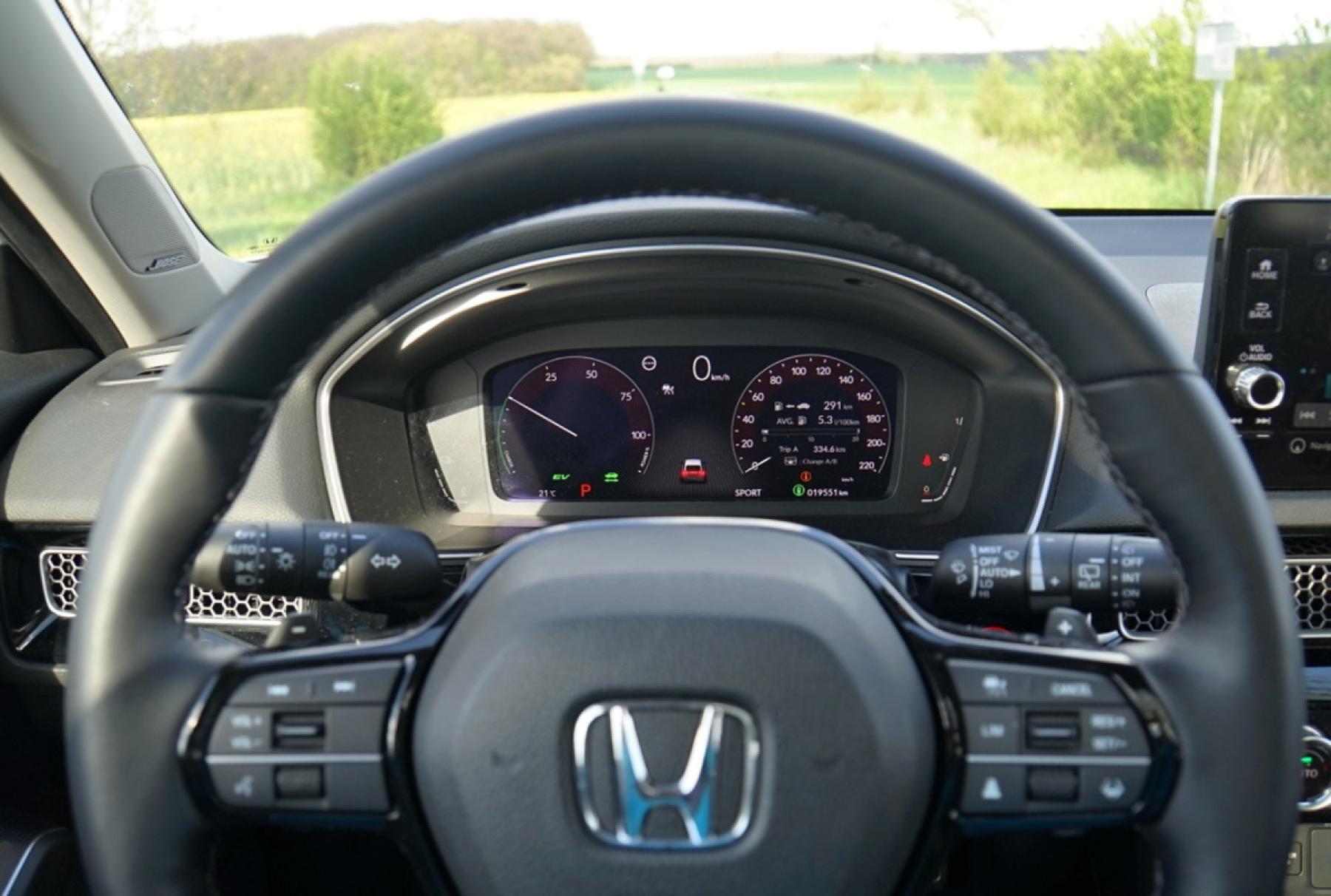 Jízda s hybridním Civicem je příjemná, tichá a hlavně snadná. Civic nejenže umí jezdit na elektřinu, elektromotor hlavně eliminuje prodlevy spalovacího motoru při sešlápnutí plynového pedálu ve vyšších rychlostech. Vůz prakticky vždy na nic nečeká a okamžitě zrychluje. Při jízdě působí daleko živějším dojmem, než naznačují oficiální udávané zrychlení. Díky pomoci elektromotoru můžete bezpečně předjíždět a velmi svižně se pohybovat v zatáčkách. Podvozek je skvěle naladěn, nevadí mu nerovnosti a myslí na řidiče. Hybridní Civic řidiče poslouchá na slovo a hned. Svou zásluhu na tom mají i skvělé pneumatiky Michelin Pilot Sport 4. Ty ve spojení s pečlivě naladěným podvozkem dělají ze Civicu skvěle řiditelné auto, které je současně komfortní. V podstatě jediné co mi na Civicu vadilo, bylo řazení pomocí tlačítek "PRND". Ty je nutné důkladně stlačit.