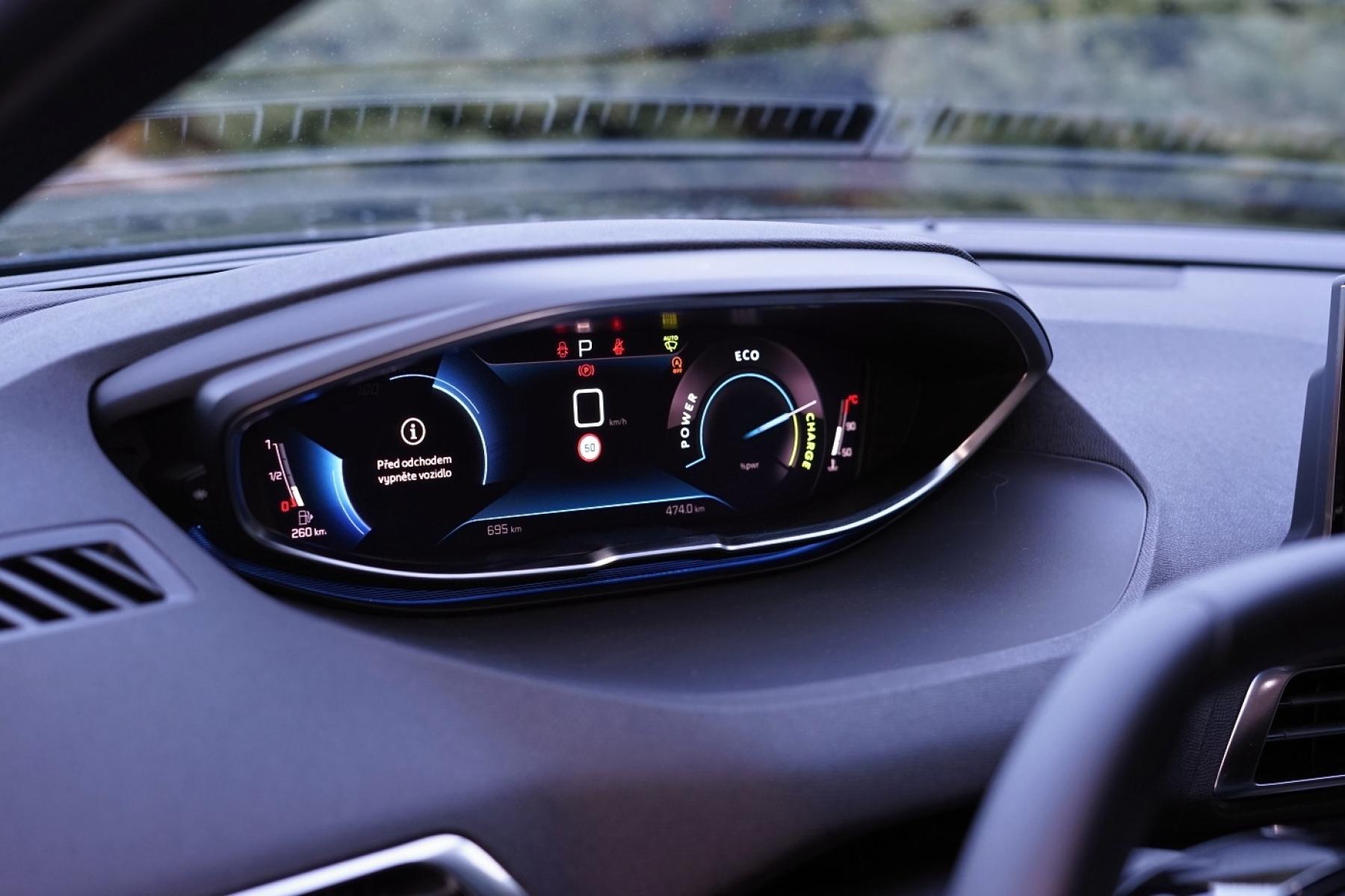 Hybrid uvnitř vozu poznáte fakticky jen podle digitálního displeje zobrazující 100% elektrickou jízdu (modrý otáčkoměr), tok energie v systému, úroveň nabití baterie, její provozní stav prostřednictvím měřiče výkonu (Charge, Eco, Power) a procento vzdálenosti ujeté v elektrickém režimu v daném okamžiku nebo na konci jízdy.