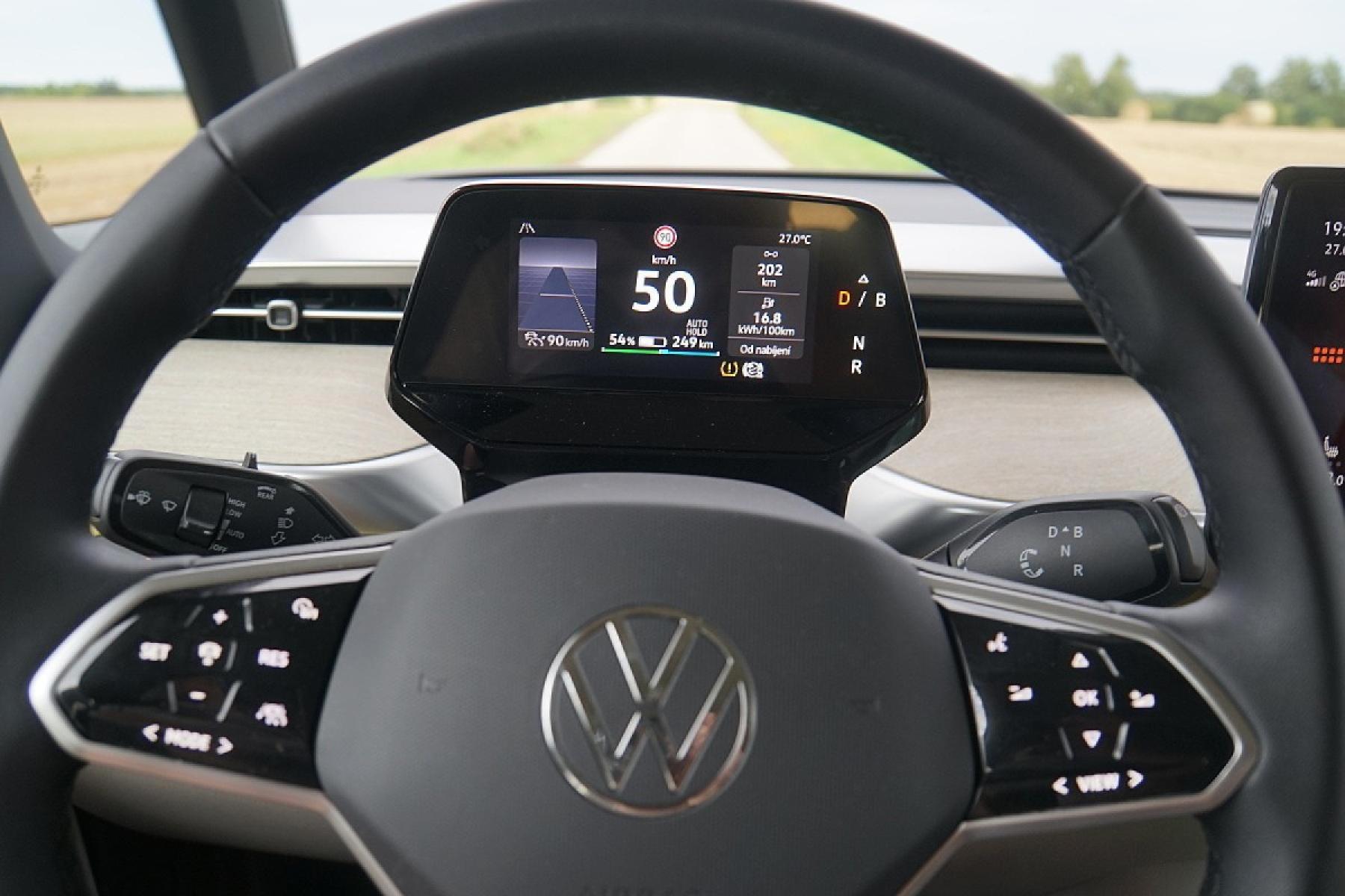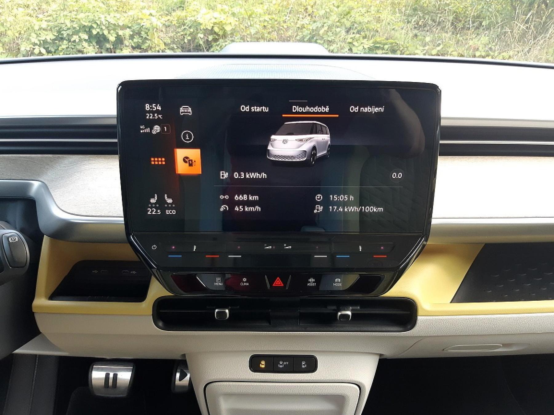 Je pravdou, že s ID. Buzzem se jezdí jinak – odlišně. Pokud s ním pojedete jako s dieselem nebo benzínem, nebudete spokojeni s dojezdem, který rapidně klesá při těžké noze na plynovém pedálu nebo při stylu jízdy "brzda-plyn". To se Buzzu vůbec nelíbí a baterie můžete vyčerpat rychle. Nám se podařilo dlouhodobou spotřebu po sedmi stovkách kilometrů udržet na hodnotě 17 kWh/100 km. Stačilo jediné, splynout s vozem. A to znamená jezdit uvolněně a nestát v kopcích na plynu. Rozhodně jsme nebyli brzdou provozu, přesto palubní počítač ukázal spotřebu hluboko pod udávanou hodnotou.