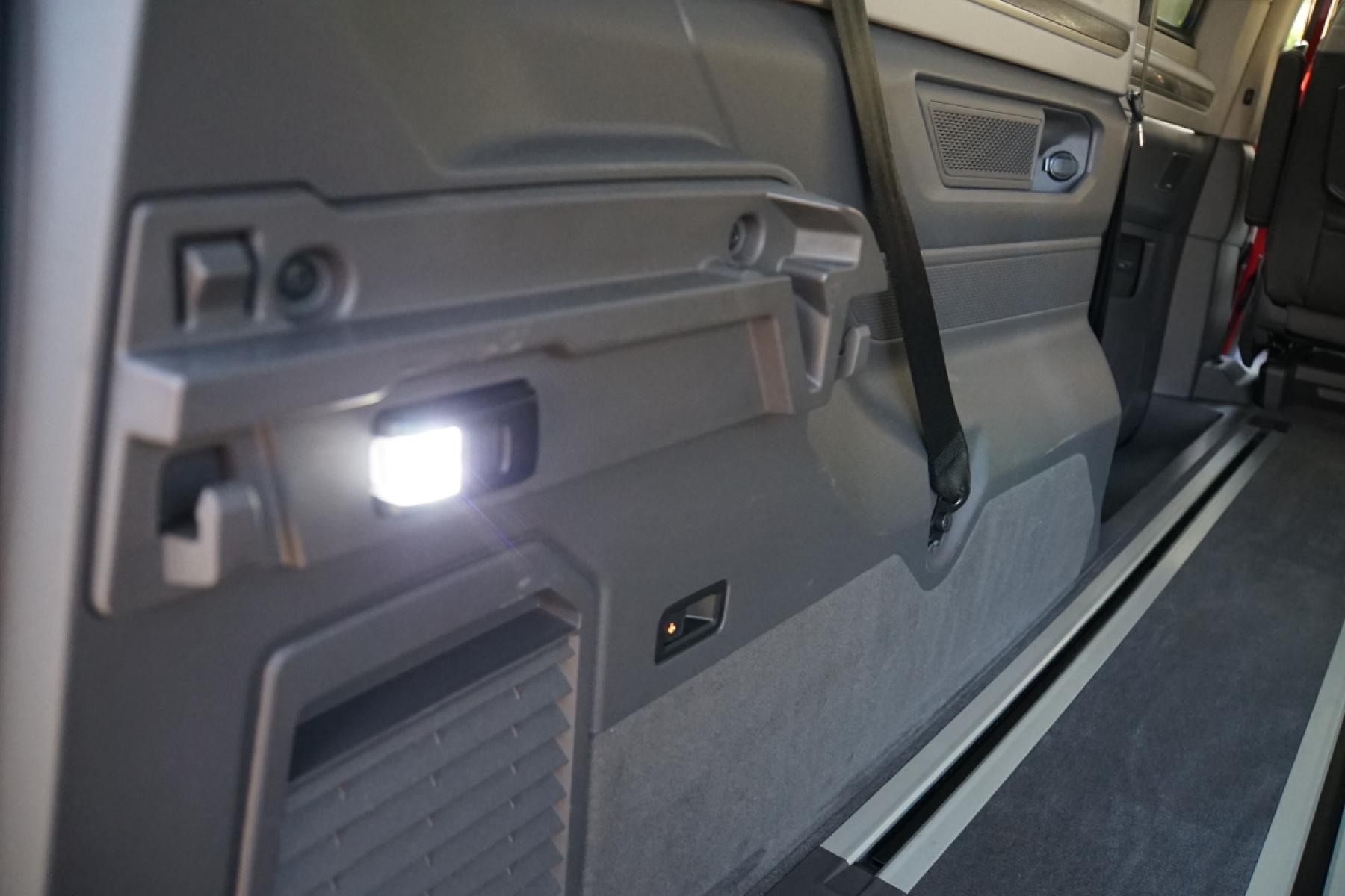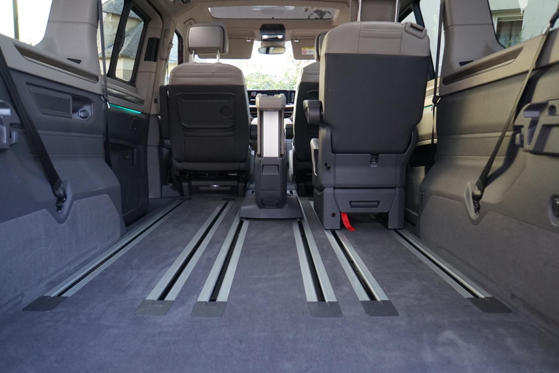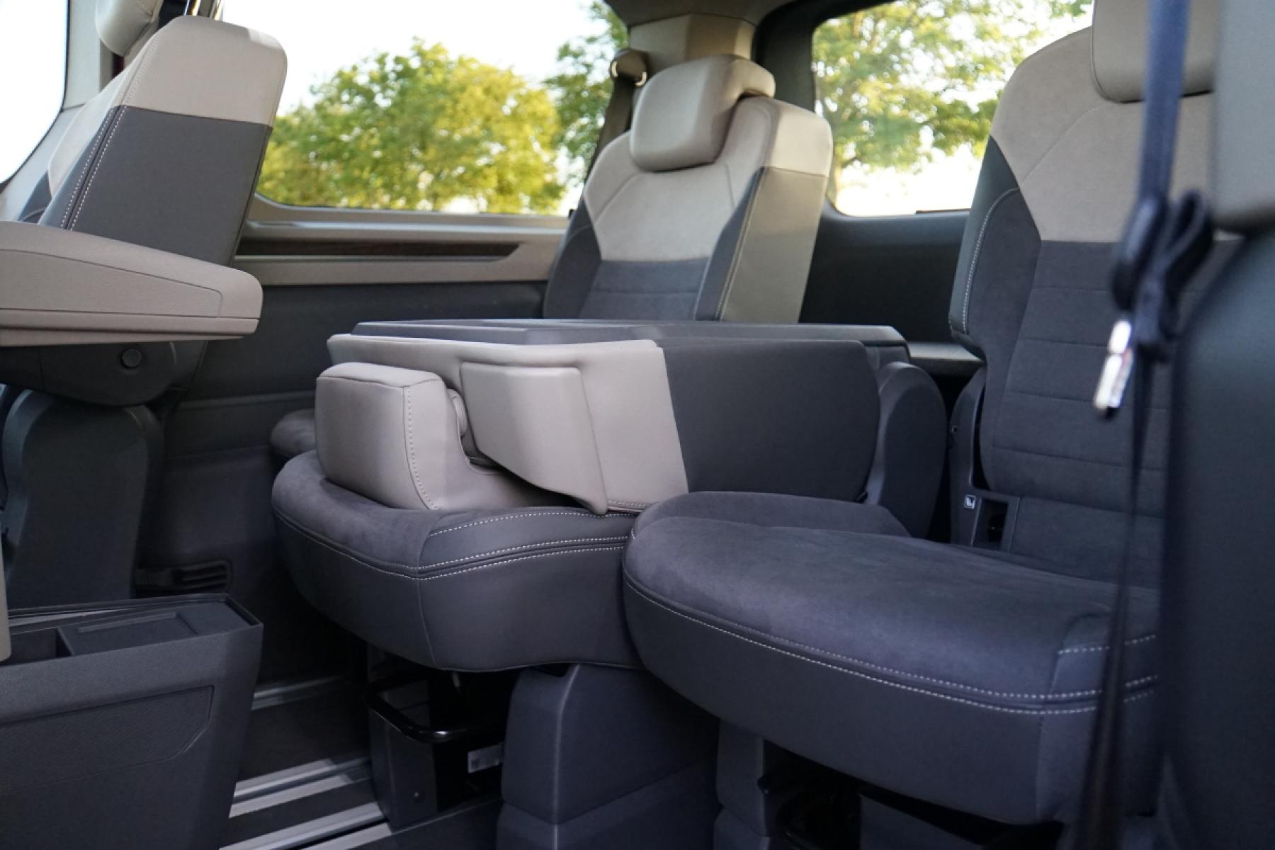 Z velkého MPV s uspořádáním sedadel 2+2+3 tak během chvilky vykouzlíte dvoumístnou dodávku, do které naložíte 2,6 metru dlouhé předměty. Sedadla lze otáčet i proti směru jízdy. U T7 mohou být všechna sedadla ve druhé a třetí řadě vyhřívaná – napájejí je zajištěno přes kolejnice. Za příplatek 17.762 Kč můžete mít multifunkční stolek. Určitě doporučujeme připlatit za vyhřívání čelního skla (+ 6.480 Kč), jelikož škrábání rozměrného a vysoko položeného skla není v zimě nic příjemného.